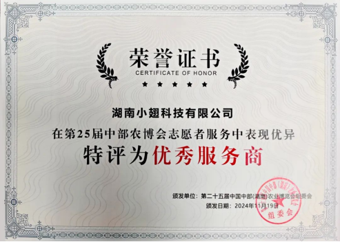 2024年5月,“小翅俠”志愿者服務團隊首次在2024年“機甲大師超級對抗賽上”亮相,獲得了主辦方、指導單位及政府對“小翅俠”志愿者服務團隊優(yōu)質(zhì)服務的高度認可與贊譽。2024年11月,“小翅俠”志愿者服務團隊亮相“第25屆中國中部(湖南)農(nóng)業(yè)博覽會”,再次以優(yōu)質(zhì)服務獲得了各方的高度認可與贊譽,并被組委會評選為“優(yōu)秀服務商”的榮譽稱號。這不僅是對“小翅俠”志愿者團隊的肯定,更是對志愿者們青春擔當?shù)恼J可。